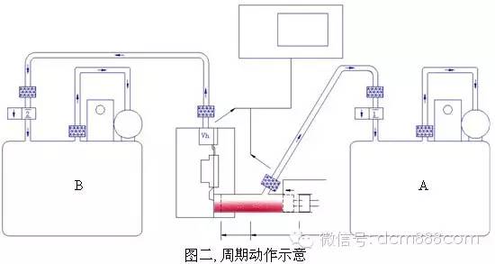 模具關(guān)閉,型腔上真空閥Vh復(fù)位開啟;定量倒料;沖頭越過熔杯倒料口,此時受“沖頭位置:熔杯真空開始”觸發(fā),泵罐A的V1開啟,真空開始于熔杯頂部排氣,并測量熔杯真空度;當(dāng)沖頭接近熔杯頂部排氣口,接到“沖頭位置:熔杯真空結(jié)束”觸發(fā),泵罐A的V1關(guān)閉,熔杯排氣結(jié)束;當(dāng)受到“沖頭位置:型腔真空開始”觸發(fā),泵罐B的V2開啟,型腔真空排氣開始,并測量型腔真空度;在“沖頭位置:型腔真空結(jié)束”觸發(fā)時,泵罐B的V2和型腔上的真空閥Vh關(guān)閉,型腔真空排氣結(jié)束;壓射結(jié)束;開模到位;取件;噴涂;再次關(guān)模到位,型腔上真空閥Vh再次復(fù)位開啟,周而復(fù)始。型腔排氣可與熔杯共同開始也可以接力進行,取決于具體工藝要求和設(shè)定。